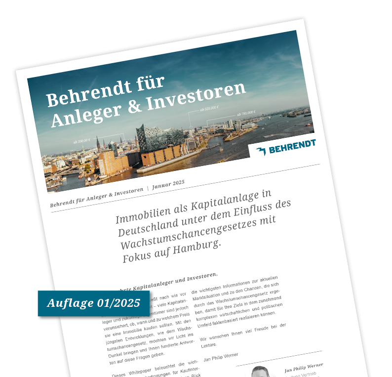 Dieses Whitepaper beleuchtet die wichtigsten Rahmenbedingungen für Kaufinteressenten in Hamburg und wirft einen Blick in die Zukunft des Neubaus. Die Behrendt Gruppe ist seit Jahrzehnten als Projektentwickler, Bauträger und Investor in der Metropolregion Hamburg aktiv. Wir bieten Ihnen die wichtigsten Informationen zur aktuellen Marktsituation und zu den Chancen, die sich durch das Wachstumschancengesetz ergeben, damit Sie Ihre Ziele in dem zunehmend komplexen wirtschaftlichen und politischen Umfeld faktenbasiert realisieren können.